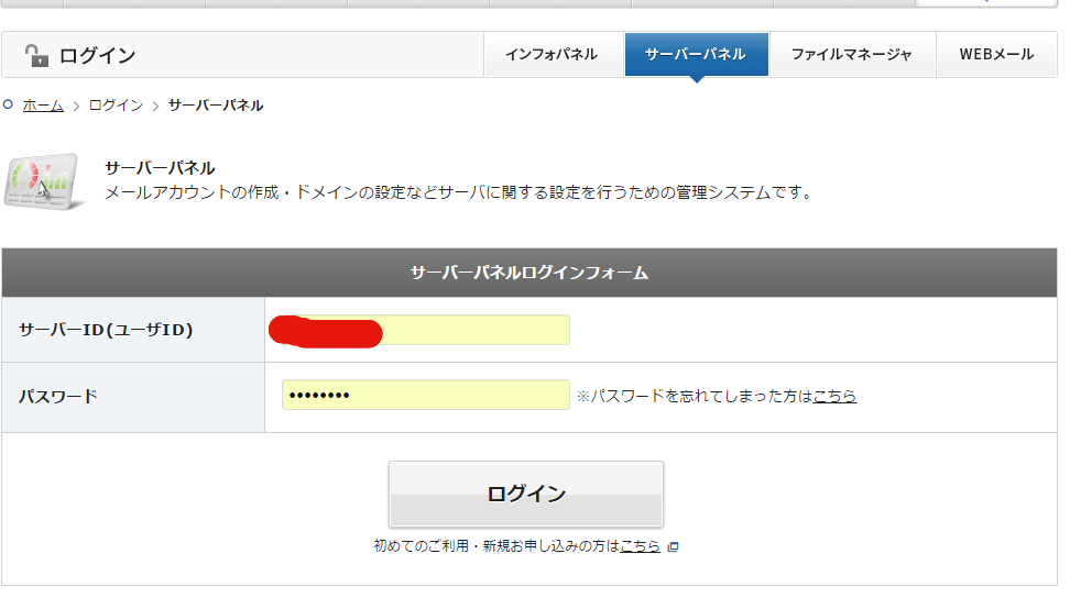 インフォパネルとサーバーパネルが上のタブから選べるので、サーバーパネルにログインします。